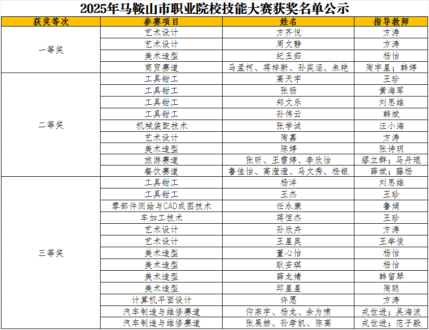 近日,2025年马鞍山市职业院校技能大赛(中职组)获奖名单正式公布,学院表现亮眼,斩获多项荣誉。