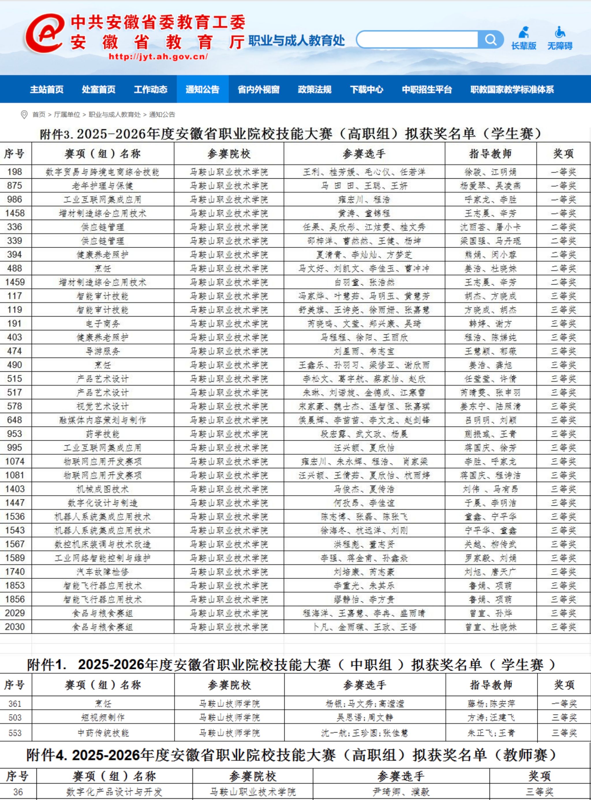 根据安徽省教育厅2025-2026年度安徽省职业院校技能大赛获奖名单公示结果,学院在中高职两个组别赛事中共获奖项38个,其中高职组获得一等奖4项、二等奖5项、三等奖26项,中职组取得一等奖1项、三等奖2项。